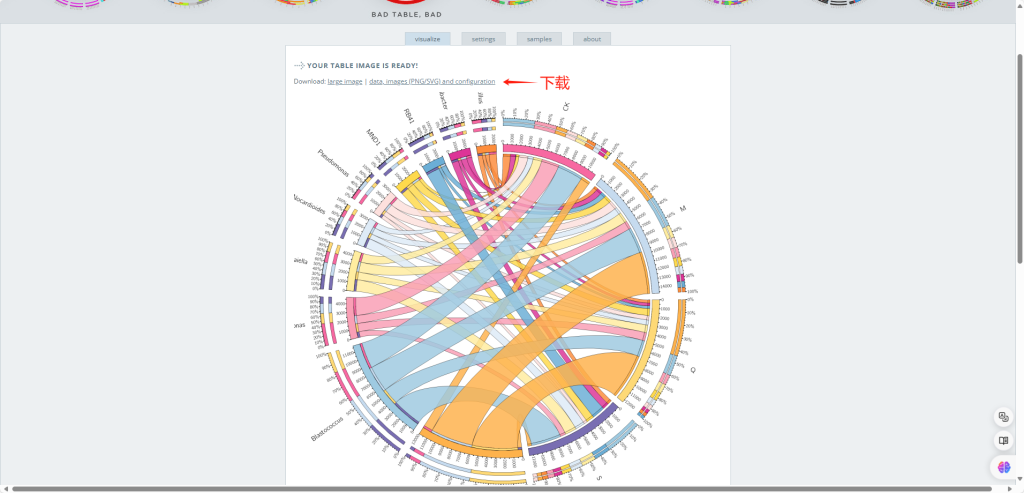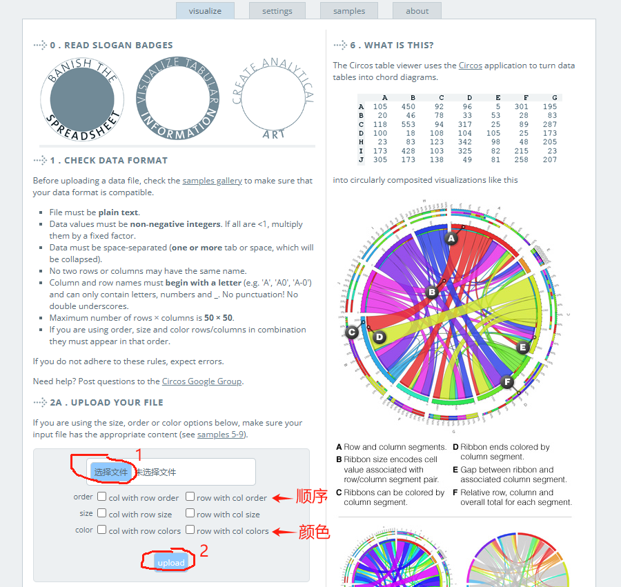 Circos在线绘图网站要求上传的数据必须属纯文本的表格数据,可以是空格分隔也可以是制表符分隔,为了让表格的展示结果更直观,统计使用制表符分隔(Tab)。同时还可以通过上传的文件格式来指定分组和物种的颜色和顺序。