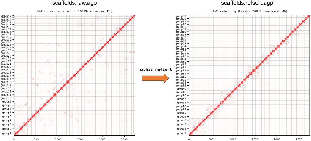 在制作HIC热图的时候,一般情况下都会把单倍型的同源染色体放在一起展示,这样看起来比较直接。Haphic可以将组装好的基因组通过另外一个近缘物种的参考基因组(染色体水平)进行比对,从而实现排序和定向。